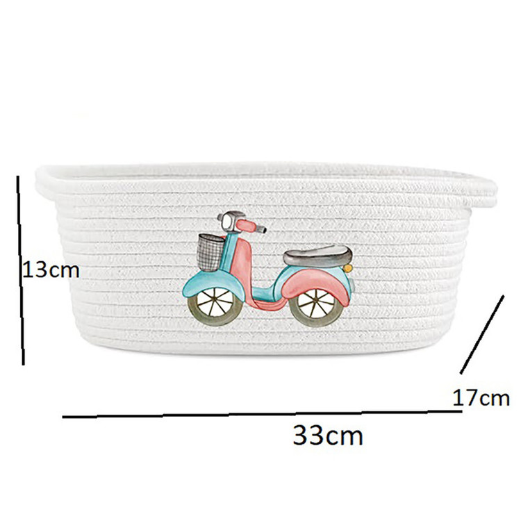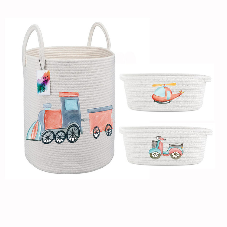 ست سبد اتاق کودک مدل وسایل نقلیه کالایی ساخته شده از ریسمان قیطان است که دوختی تمیز و محکم دارد. این کالا شامل یک سبد اسباب بازی به قطر 30 سانتیمتر و ارتفاع ۴۰ سانتیمتر و دو سبد بیضی نظم دهنده به سایز طول 33 و عرض 17 با ارتفاع 13 سانتیمتر است. این محصول قابل شستشو در ماشین لباسشویی و یا بصورت دستی میباشد.