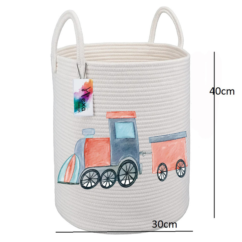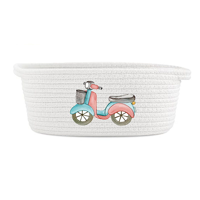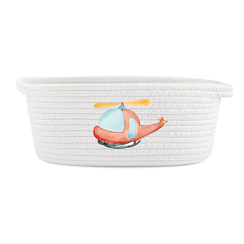 ست سبد اتاق کودک مدل وسایل نقلیه کالایی ساخته شده از ریسمان قیطان است که دوختی تمیز و محکم دارد. این کالا شامل یک سبد اسباب بازی به قطر 30 سانتیمتر و ارتفاع ۴۰ سانتیمتر و دو سبد بیضی نظم دهنده به سایز طول 33 و عرض 17 با ارتفاع 13 سانتیمتر است. این محصول قابل شستشو در ماشین لباسشویی و یا بصورت دستی میباشد.