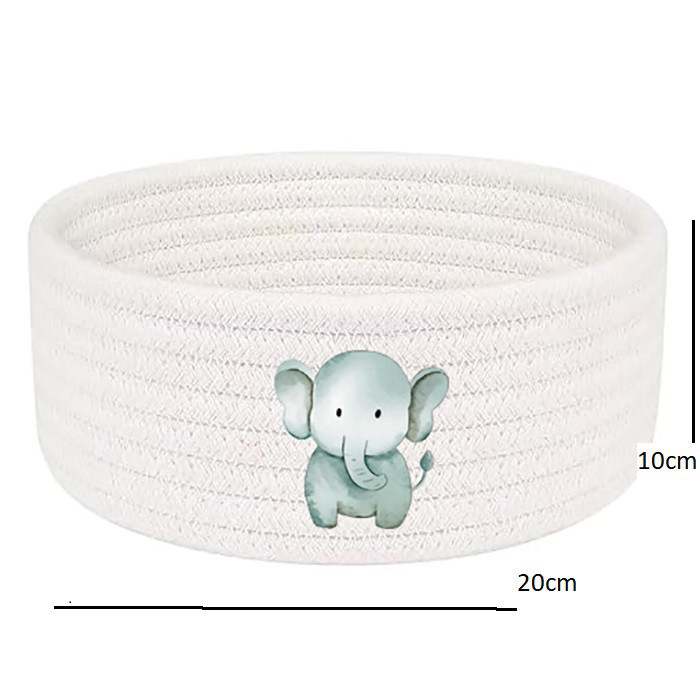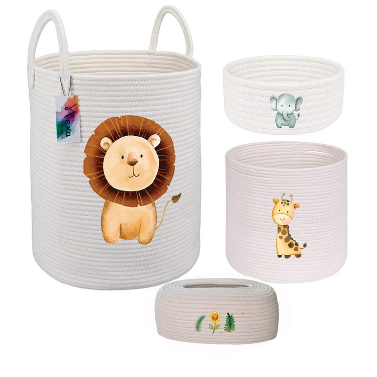 ست سبد اتاق کودک مدل حیوانات جنگل کالایی ساخته شده از ریسمان قیطان است که دوختی تمیز و محکم دارد. این کالا شامل یک سبد اسباب بازی به قطر 30سانتیمتر و ارتفاع ۴۰ سانتیمتر و یک سطل و جای دستمال و یک سبد گرد نظم دهنده است. این محصول قابل شستشو در ماشین لباسشویی و یا بصورت دستی میباشد.
