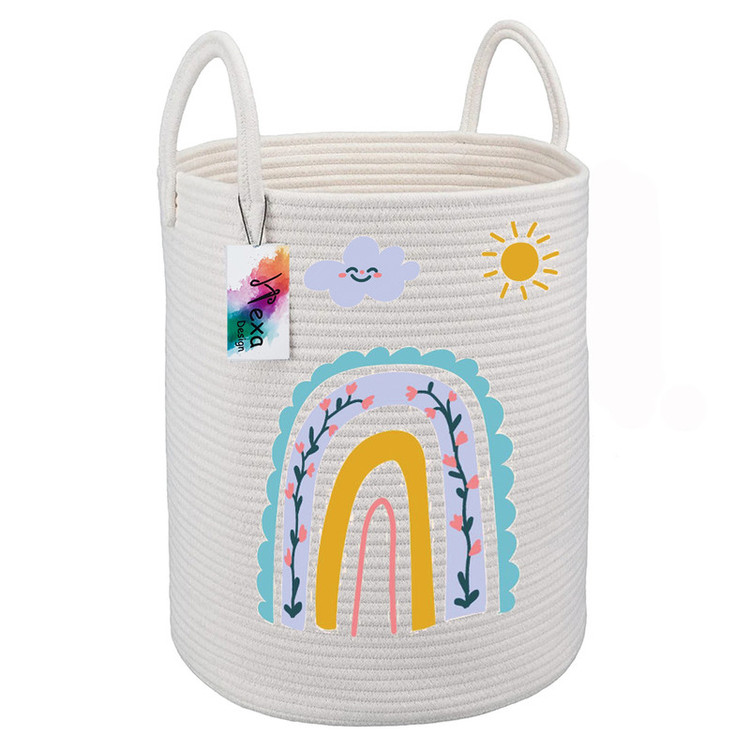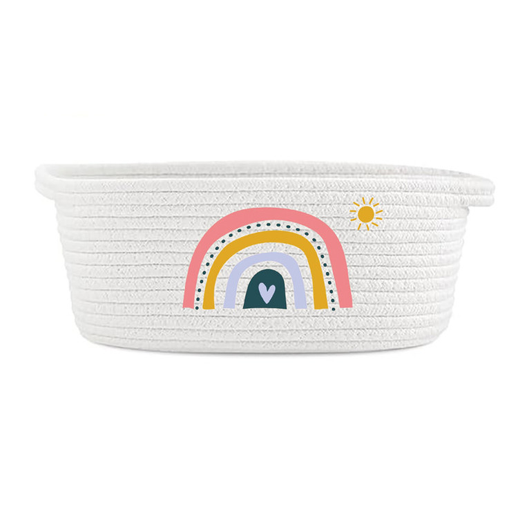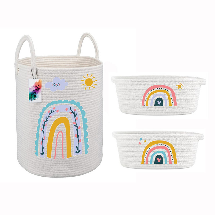 ست سبد اتاق کودک مدل رنگین کمان کالایی ساخته شده از ریسمان قیطان است که دوختی تمیز و محکم دارد. این کالا شامل یک سبد اسباب بازی به قطر 30 سانتیمتر و ارتفاع ۴۰ سانتیمتر و دو سبد بیضی نظم دهنده به سایز طول 33 و عرض 17 با ارتفاع 13 سانتیمتر است. این محصول قابل شستشو در ماشین لباسشویی و یا بصورت دستی میباشد.