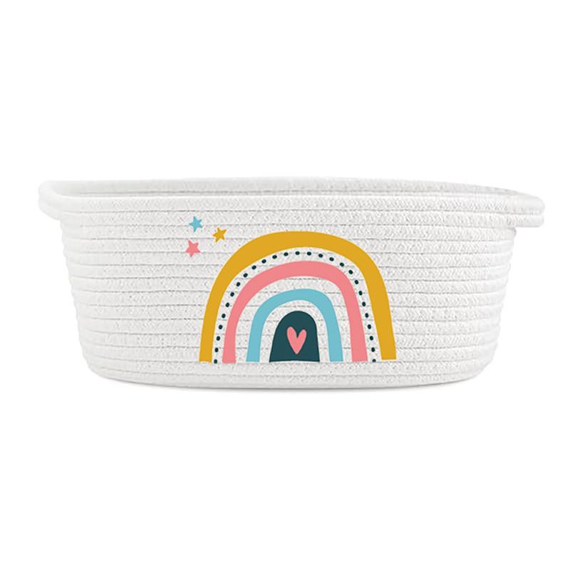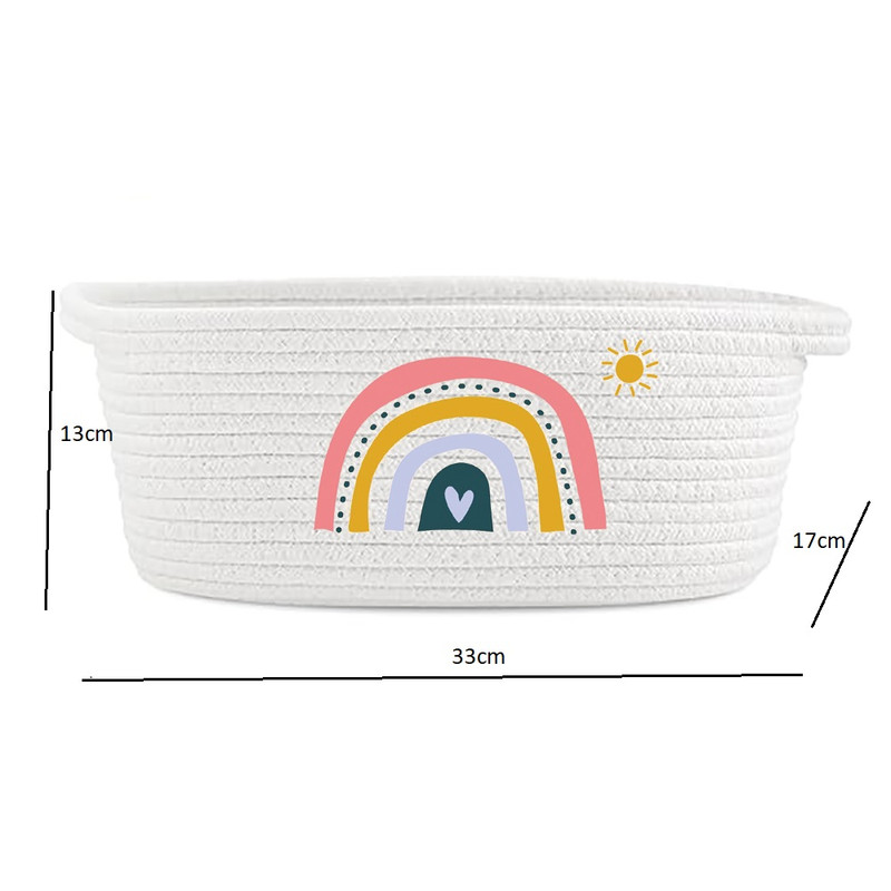 ست سبد اتاق کودک مدل رنگین کمان کالایی ساخته شده از ریسمان قیطان است که دوختی تمیز و محکم دارد. این کالا شامل یک سبد اسباب بازی به قطر 30 سانتیمتر و ارتفاع ۴۰ سانتیمتر و دو سبد بیضی نظم دهنده به سایز طول 33 و عرض 17 با ارتفاع 13 سانتیمتر است. این محصول قابل شستشو در ماشین لباسشویی و یا بصورت دستی میباشد.
